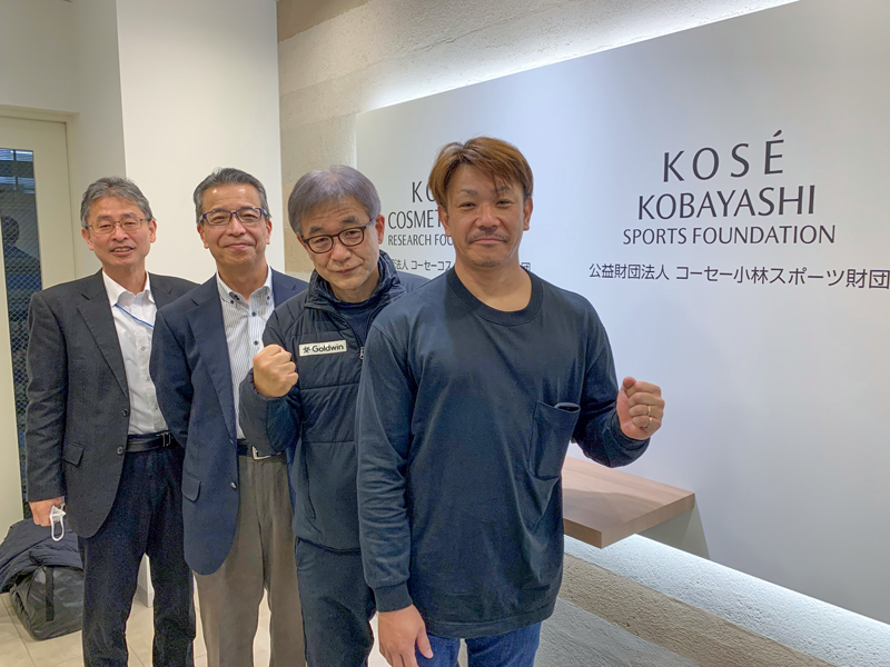 右から、源 貴晴 選手、渡辺 孝次(日本障害者スキー連盟 パラノルディック委員長)、鈴木 一弘(コーセー小林スポーツ財団専務理事・事務局長)、竹島 健二(株式会社コーセー経営企画部)